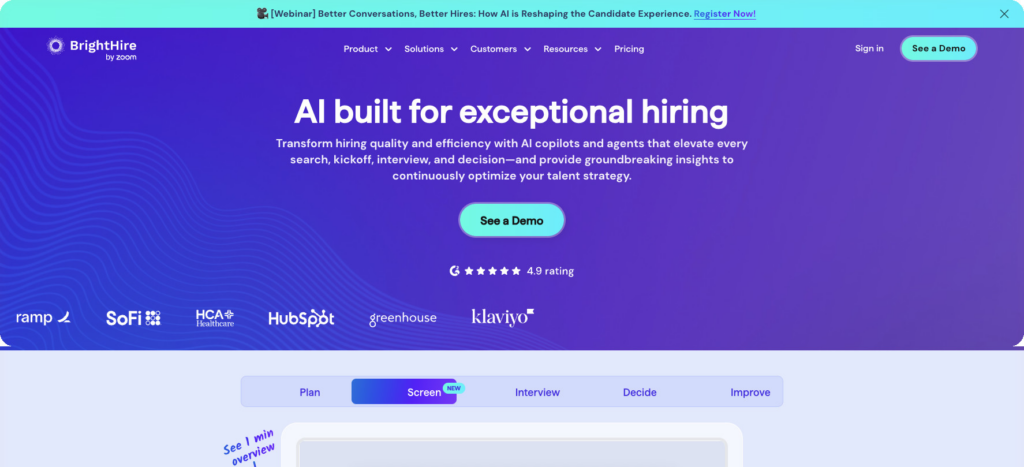 - BrightHire: Interview recording and intelligence, built around scorecards and coaching visibility