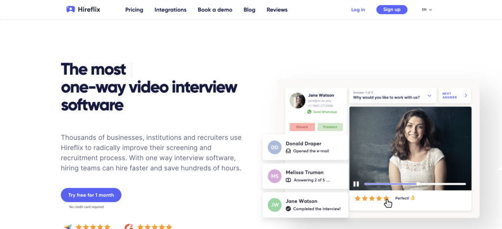 - Hireflix: One-way asynchronous video interviews with simple, flat pricing