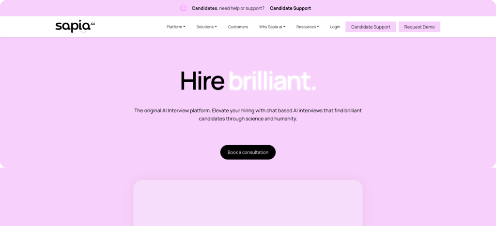 - Sapia.ai: Chat-based, asynchronous first interviews for high-volume hiring