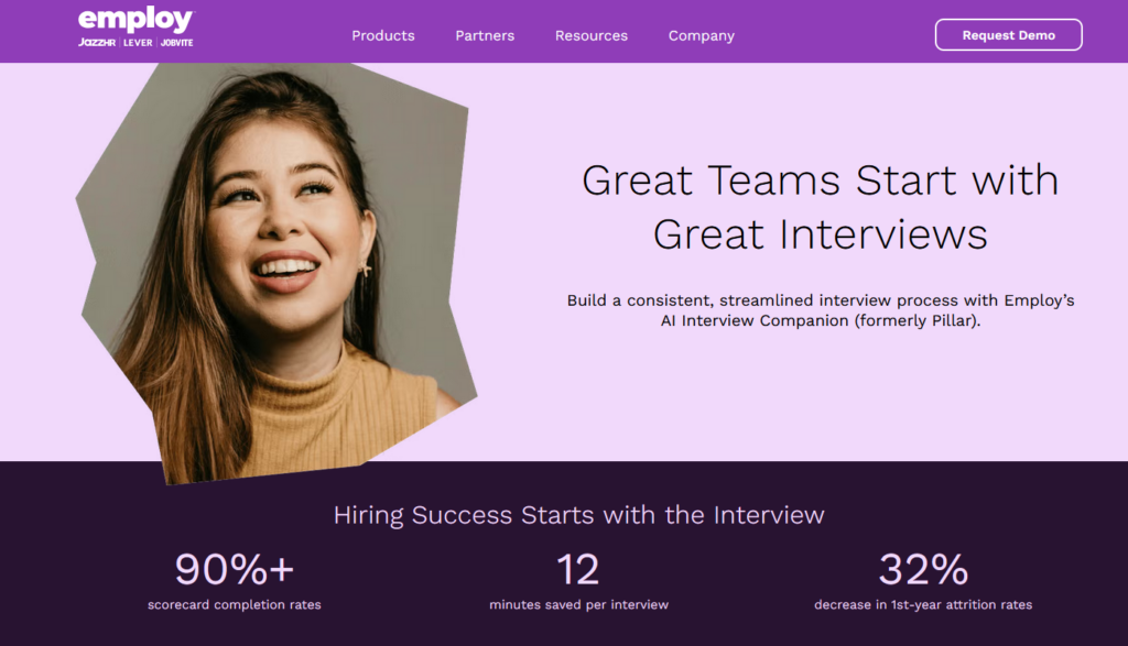 Pillar was acquired by Employ and is now positioned as Employ’s AI Interview Companion. The core focus is reducing the variance between interviews: prompts, structured frameworks, and post-interview analytics so hiring decisions rest on comparable evidence.